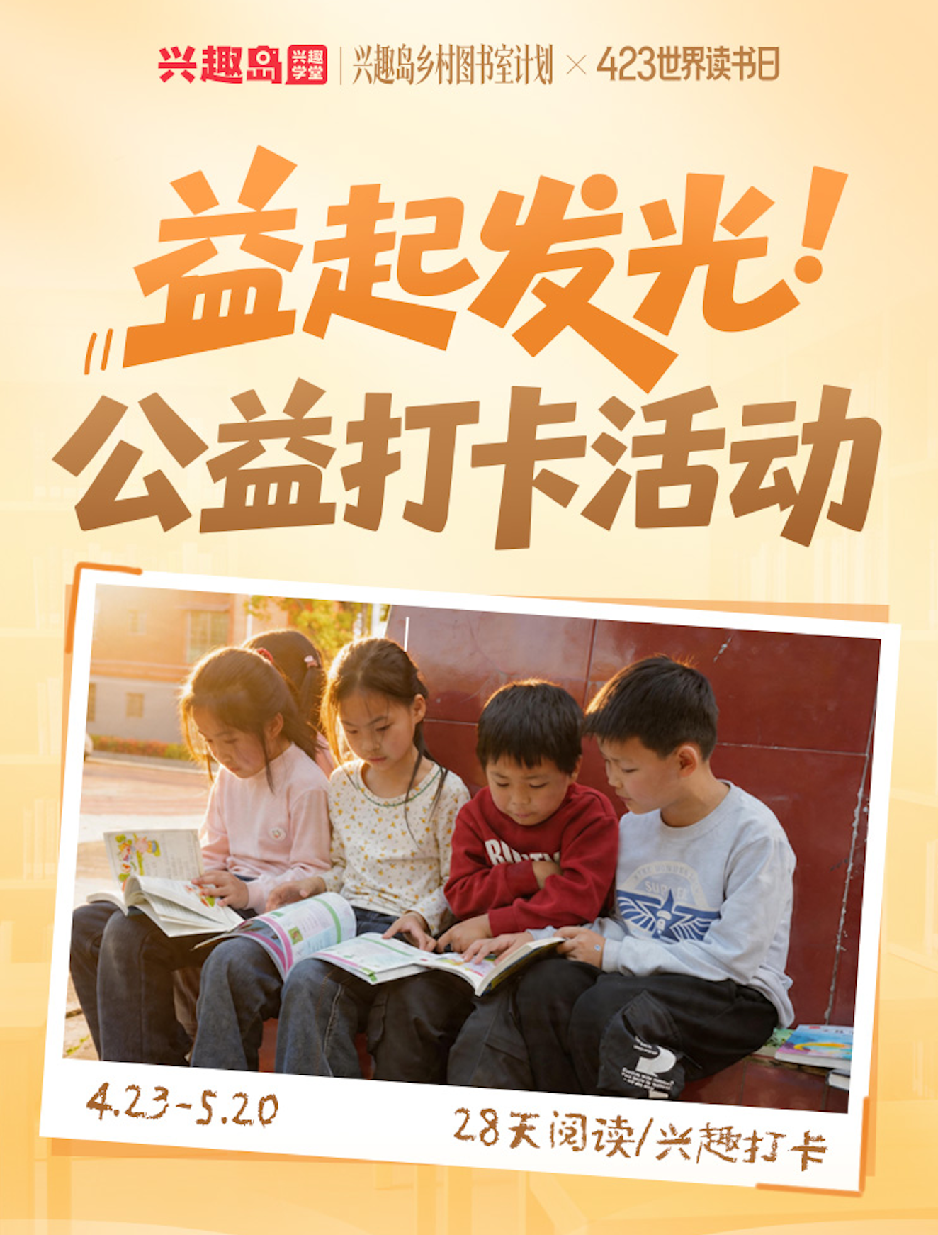 在4·23世界读书日期间,国内在线兴趣学习行业标杆企业兴趣岛,正式启动“益起发光”线上公益活动。作为兴趣岛乡村图书室计划中的重要组成部分,本次活动以“阅读+兴趣+公益”的创新模式,邀请用户共同完成一场为期28天的温暖约定——用学习点亮热爱,用善意照亮乡村儿童的阅读之路。
